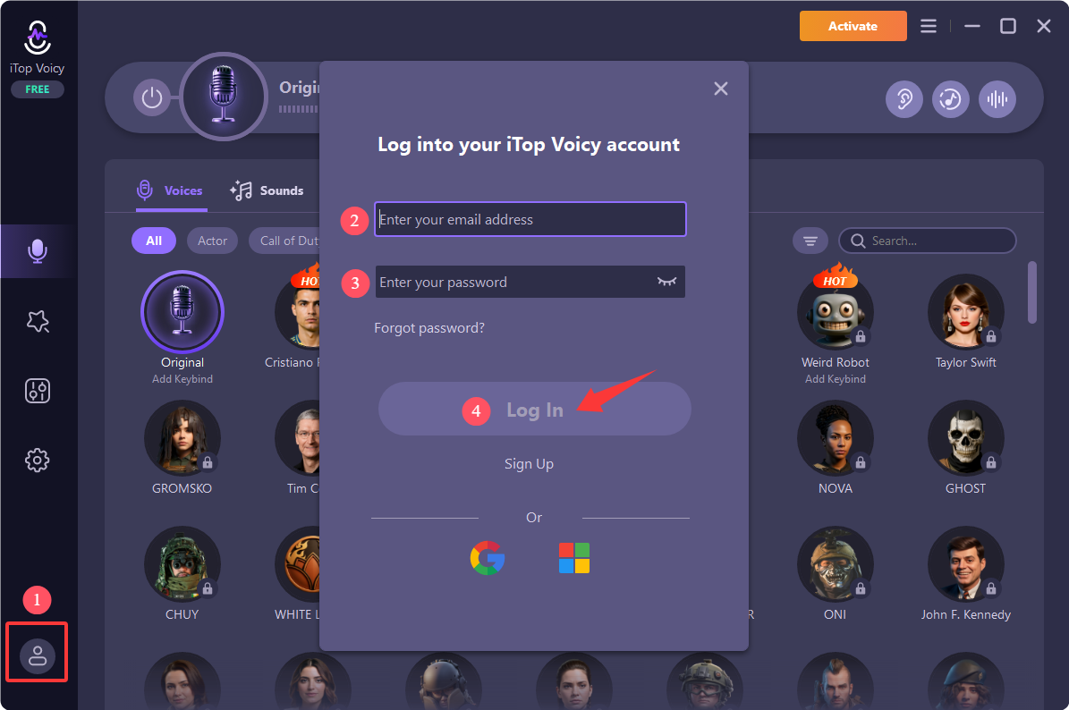 3. أدخل حساب iTop VPN وكلمة المرور الخاصة بك، انقر فوق تسجيل الدخول زر.